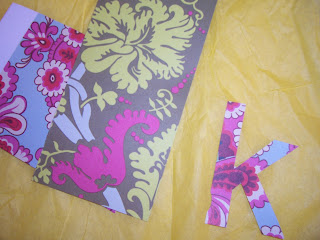 I printed out letters that I typed in the computer. I like using lowercase letters. The "k" pictured below was enlarged to 300 and I used the font arial. I cut it out and used it as a template on the Amy Butler paper.