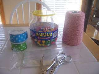 I put about one cup of gumballs in each clear bag. If you get the small gumballs at Walmart you can get about 8 bags from one container. I then tied them with wide polka dot ribbon. I tied the tag on with the red and white twine and presto you are done.